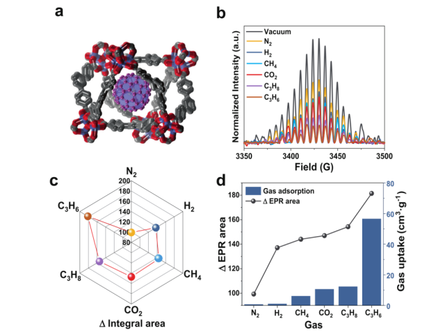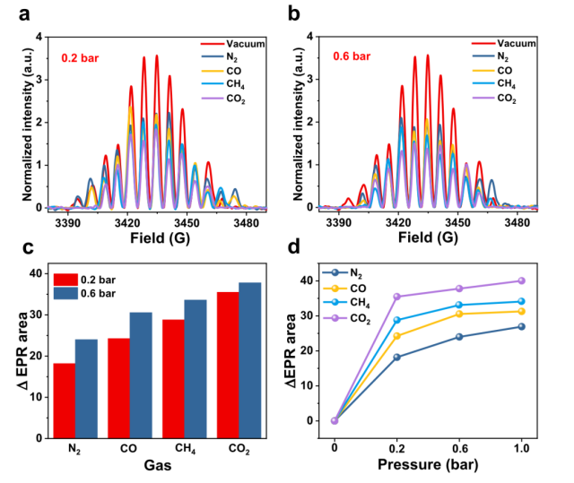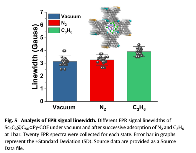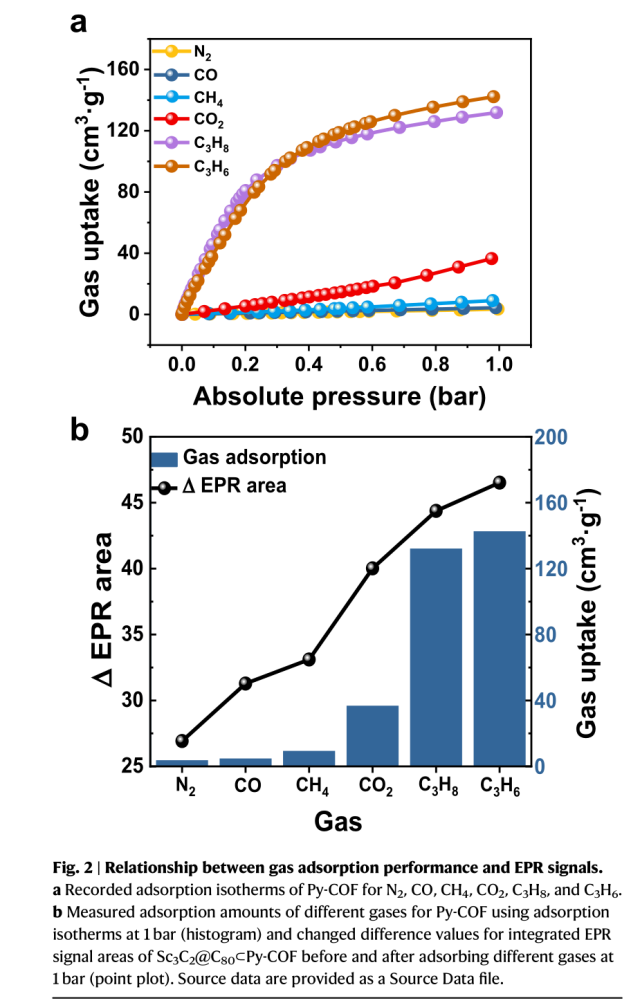 Researcher Wang from the Institute of Chemistry, Academy of Sciences, has developed a nano spin sensor based on metallofullerene for detecting gas adsorption inside porous organic frameworks. Paramagnetic metallofullerene, Sc3C2@C80, is embedded in nanoscale pores of a pyrene-based covalent organic framework (Py-COF). The EPR Spectroscopy (CIQTEK EPR200-Plus) is used to record the EPR signals of the embedded Sc3C2@C80 spin probe for N2, CO, CH4, CO2, C3H6, and C3H8 adsorbed within Py-COF. The study reveals that the EPR signals of embedded Sc3C2@C80 exhibit a regular dependence on the gas adsorption performance of Py-COF. The research findings are published in Nature Communications under the title "Embedded nano spin sensor for in situ probing of gas adsorption inside porous organic frameworks. "