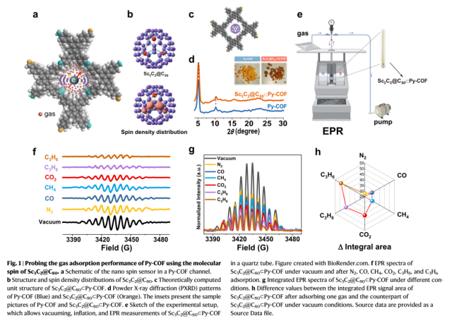 In the study, the authors used a paramagnetic metallofullerene, Sc3C2@C80 (size approximately 0.8 nm), as a spin probe embedded in a pyrene-based covalent organic framework (Py-COF) nanocage to detect gas adsorption in Py-COF. The adsorption performance of N2, CO, CH4, CO2, C3H6, and C3H8 gases in Py-COF was investigated by monitoring the embedded Sc3C2@C80 Electron Paramagnetic Resonance (EPR) signal. The study demonstrated that the EPR signal of Sc3C2@C80 was systematically related to the gas adsorption performance of Py-COF. Additionally, unlike traditional adsorption isotherm measurements, this implantable nanoscale spin sensor enabled real-time gas adsorption and desorption monitoring. The proposed nanoscale spin sensor was also utilized to investigate the gas adsorption performance of a metal-organic framework (MOF-177), showcasing its multifunctionality.
